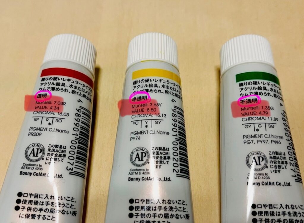 アクリル絵の具は、透明、半透明、不透明